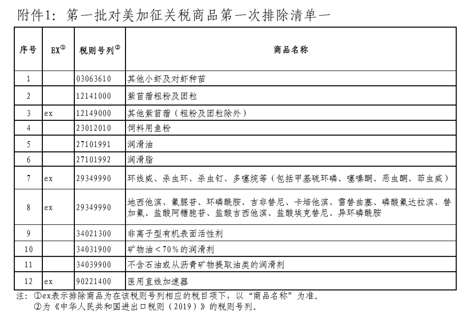 根据《国务院关税税则委员会关于试行开展对美加征关税商品排除工作的公告》(税委会公告[2019]2号),经国务院批准,国务院关税税则委员会11日公布第一批对美加征关税商品第一次排除清单,对第一批对美加征关税商品,第一次排除部分商品,自2019年9月17日起实施。