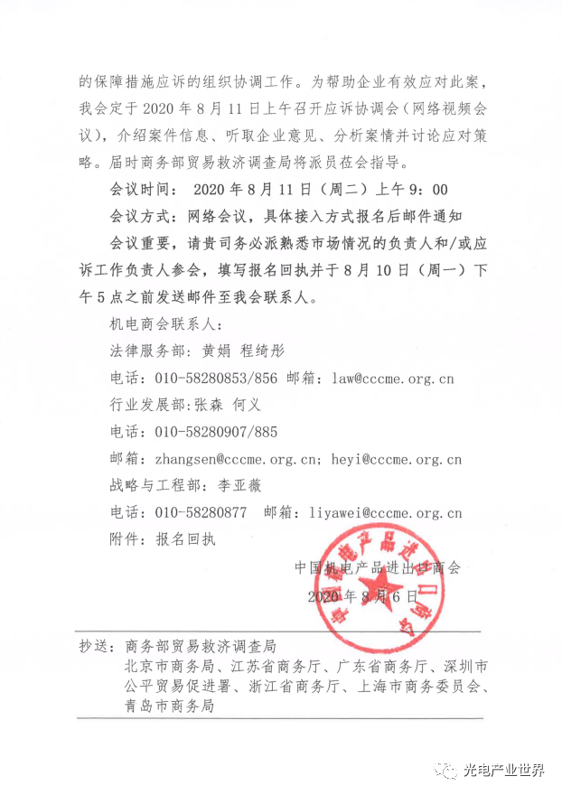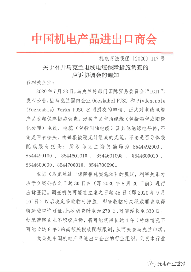 2020年7月28日,乌克兰跨部门国际贸易委员会(“ICIT”)发布公告,应乌克兰国内企业Odeskabel PJSC 和Pivdencable (Yuzhcable) Works PJSC公司提交的申请,正式对电线电缆产品发起保障措施调查。涉案产品包括绝缘(包括漆包或阳极化处理)电线、电缆(包括同轴电缆)及其他绝缘电导体,不论是否有接头,由每根被覆光纤组成的光缆,不论是否导体装配或装有接头;所涉乌克兰海关编码为8544492000、8544499100、8544601010、8544601098、8544609010、8544609090、8544700010、8544700090。根据《乌克兰进口保障措施实施法》的规定,利害关系方应于立案公告之日起30日内(即2020年8月26日前)进行应诉登记。调查机关可能在立案之日起45日(即2020年9月10日)以后决定采取临时措施,即征收临时关税或要求取得特殊进口许可证。此次调查时限为270日,可能延长至330日。如果涉案企业不积极应诉,将可能获得长达4年(特殊情况下可能长达8年)的高额关税或配额限制,从而失去乌克兰市场。我会是中国机电产品进出口企业的行业组织,负责本行业的保障措施应诉的组织协调工作。为帮助企业有效应对此案,我会定于2020年8月11日(周二)上午召开应诉协调会(网络视频会议),介绍案件信息、听取企业意见、分析案情并讨论应对策略。届时商务部贸易救济局将派员莅会指导。会议时间:2020年8月11日(周二)上午9:00会议重要,请贵司务必派熟悉市场情况的负责人和/或应诉工作负责人参会,填写报名回执并于8月10日(周一)下午5点之前发送邮件至我会联系人。邮箱:zhangsen@cccme.org.cn;