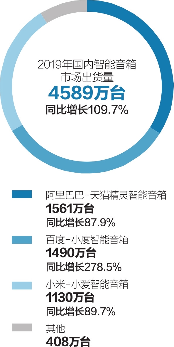 3月20日,国际咨询机构IDC发布《2019年中国智能音箱市场出货量》报告。2019年国内智能音箱市场出货量达到4589万台,同比增长109.7%,继续延续了高增长态势,成为新兴“爆款”消费电子品类。其中今年一个尤为注意的是,市场份额向头部企业集中,阿里巴巴、百度和小米的市场份额占比超过9成。