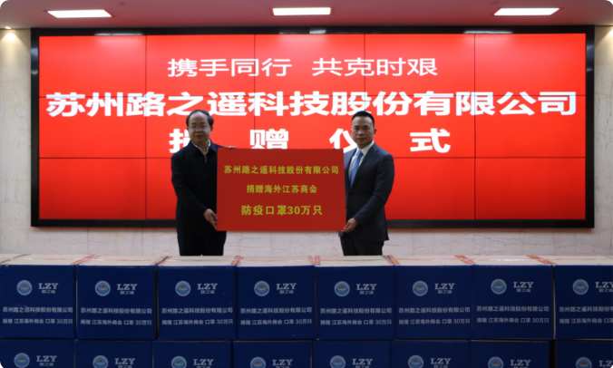 4月8日下午,苏州路之遥科技股份有限公司通过省委统战部、省工商联向海外江苏商会、海外江苏侨胞捐赠30万只防疫口罩。省委统战部副部长、省工商联党组书记顾万峰出席仪式并讲话,省工商联党组成员、副主席丁荣余主持仪式。